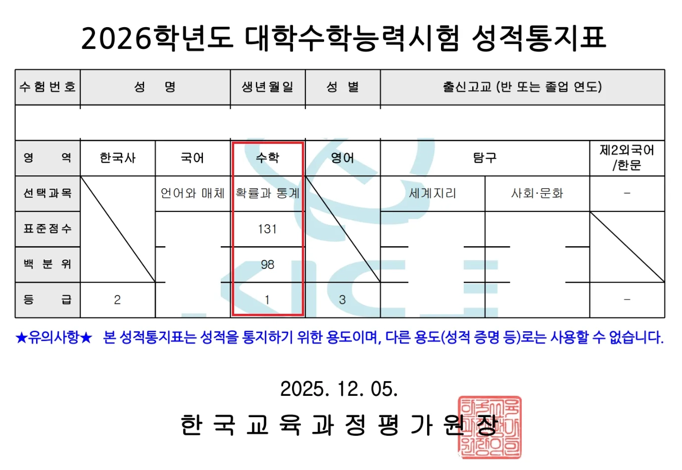 이번엔 💯 1등급을 찍었습니다.